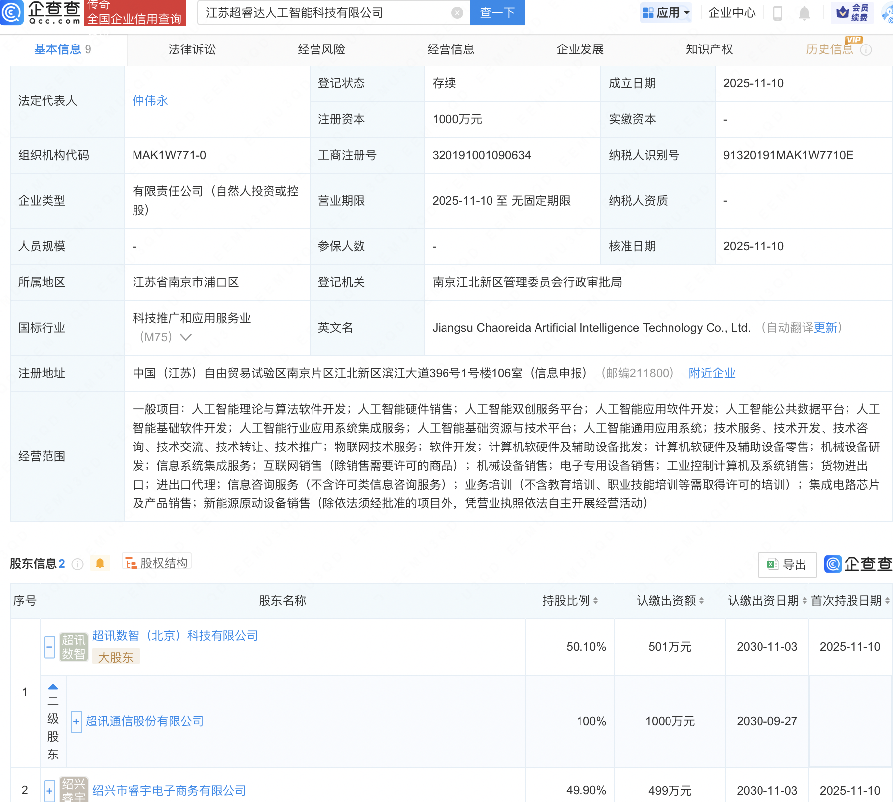 近日,江苏超睿达人工智能科技有限公司成立,注册资本1000万元低息炒股杠杠开户,经营范围包含:人工智能理论与算法软件开发;人工智能硬件销售;人工智能双创服务平台;人工智能应用软件开发等。企查查股权穿透显示,该公司由超讯通信(603322)全资子公司超讯数智(北京)科技有限公司等共同持股。
